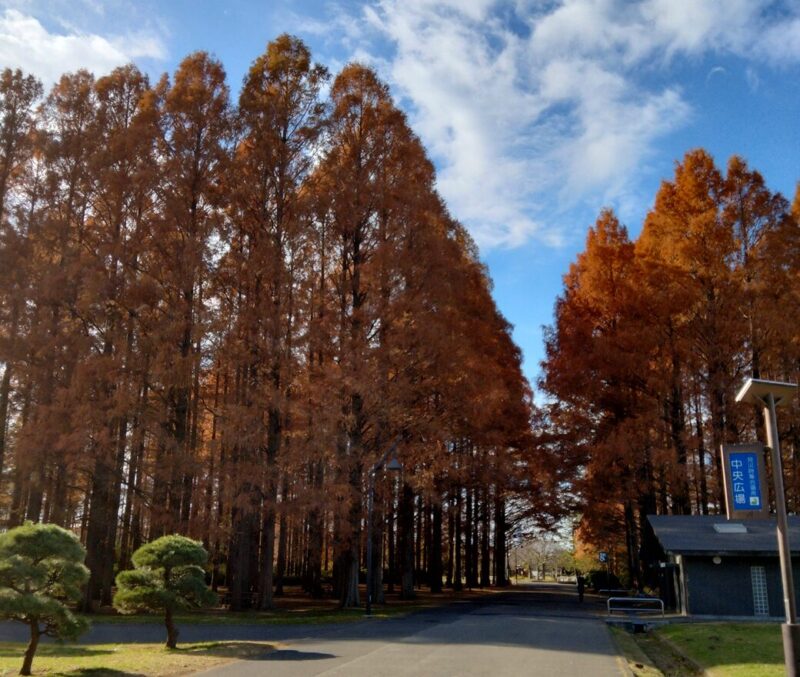 - 秋のメタセコイアの紅葉と野鳥のコラボレーションが美しい