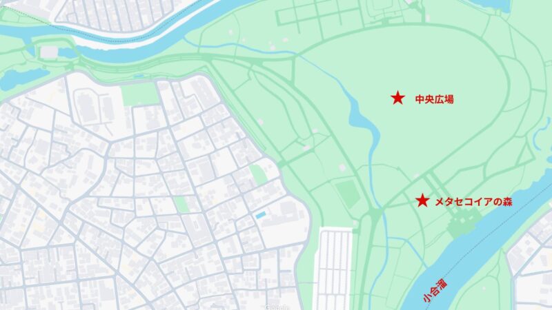 園内には小合溜という水域も含まれており、陸地部分だけでなく水辺の空間も含めた総合的な広さが、この公園のスケール感を形作っています。なお、埼玉県との県境にあり、県境が確定していない場所もあるため、現在でも正確な面積は確定していません。