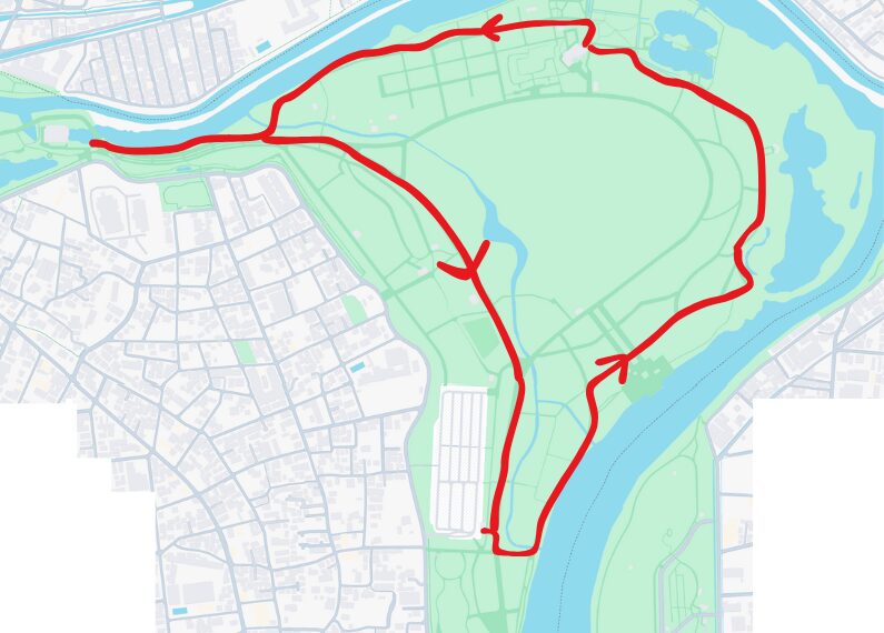 公園の外周に沿って主要な見どころ(上の地図)を巡る場合、往復の距離は約6km前後、所要時間は2時間が目安となります。端から端までだと約8kmにもなります。