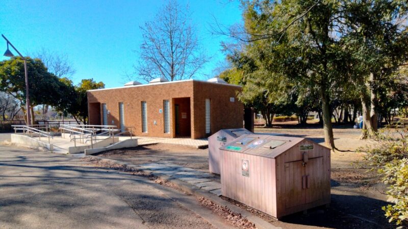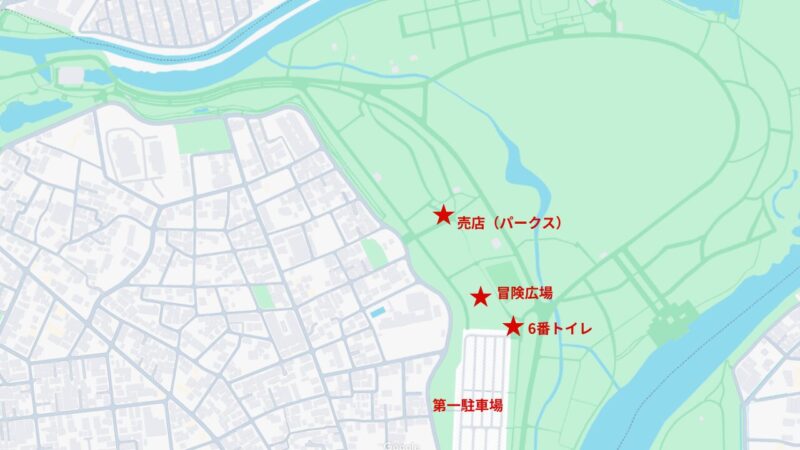冒険広場から最も近いトイレは、広場の南側に位置する公衆トイレ(6番トイレ)です。徒歩1分ほどの距離にあり、男女別に加えて多目的トイレも完備されています。